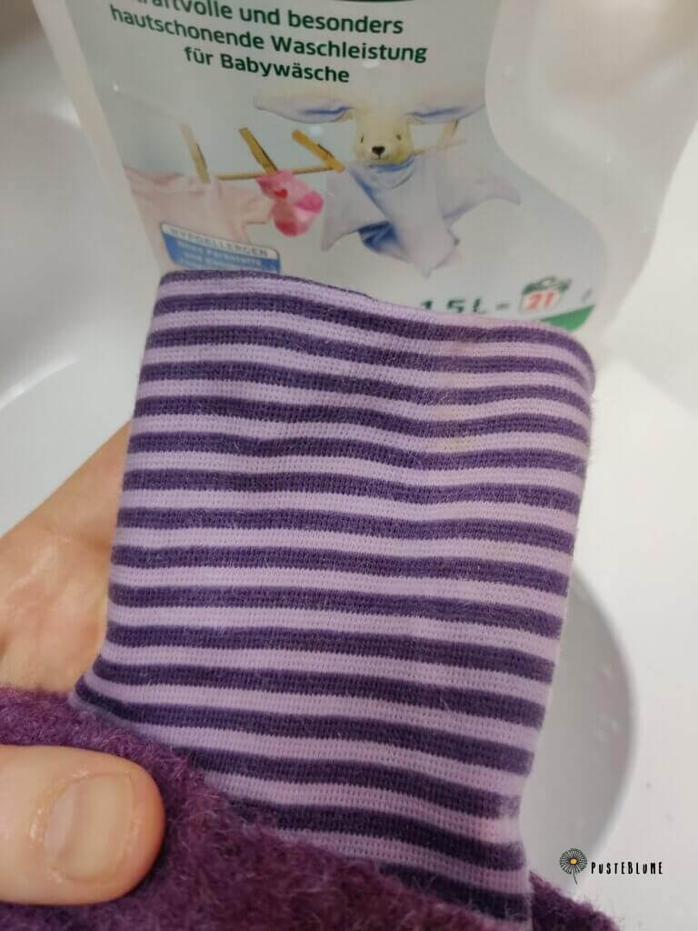 Euer Kind stolpert und stützt sich mit den Händen ab oder greift nach vermeintlichen Schätzen, die auf dem matschigen Boden liegen. Trocknen und Ausbürsten reicht hier nur bedingt. Damit die Bündchen wieder richtig schön sauber werden und um den Wollwalk dennoch zu schonen, empfehlen wir die Bündchen kurz per Hand auszuwaschen. Einfach im Waschbecken mit ein bisschen Waschmittel und lauwarmen Wasser aneinander reiben und anschließend wieder ausspülen – ich habe es ausprobiert – es geht wirklich schnell.