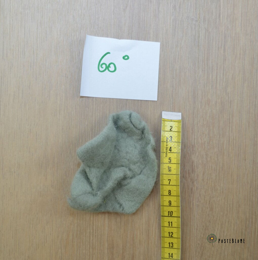 Das erste Fleckerl war im Wollprogramm, kalt, ohne Schleudern und mit Feinwaschmittel – die Länge hat sich um rund 15 % reduziert. Wie war das dann mit dem 30° und 60° Programm?