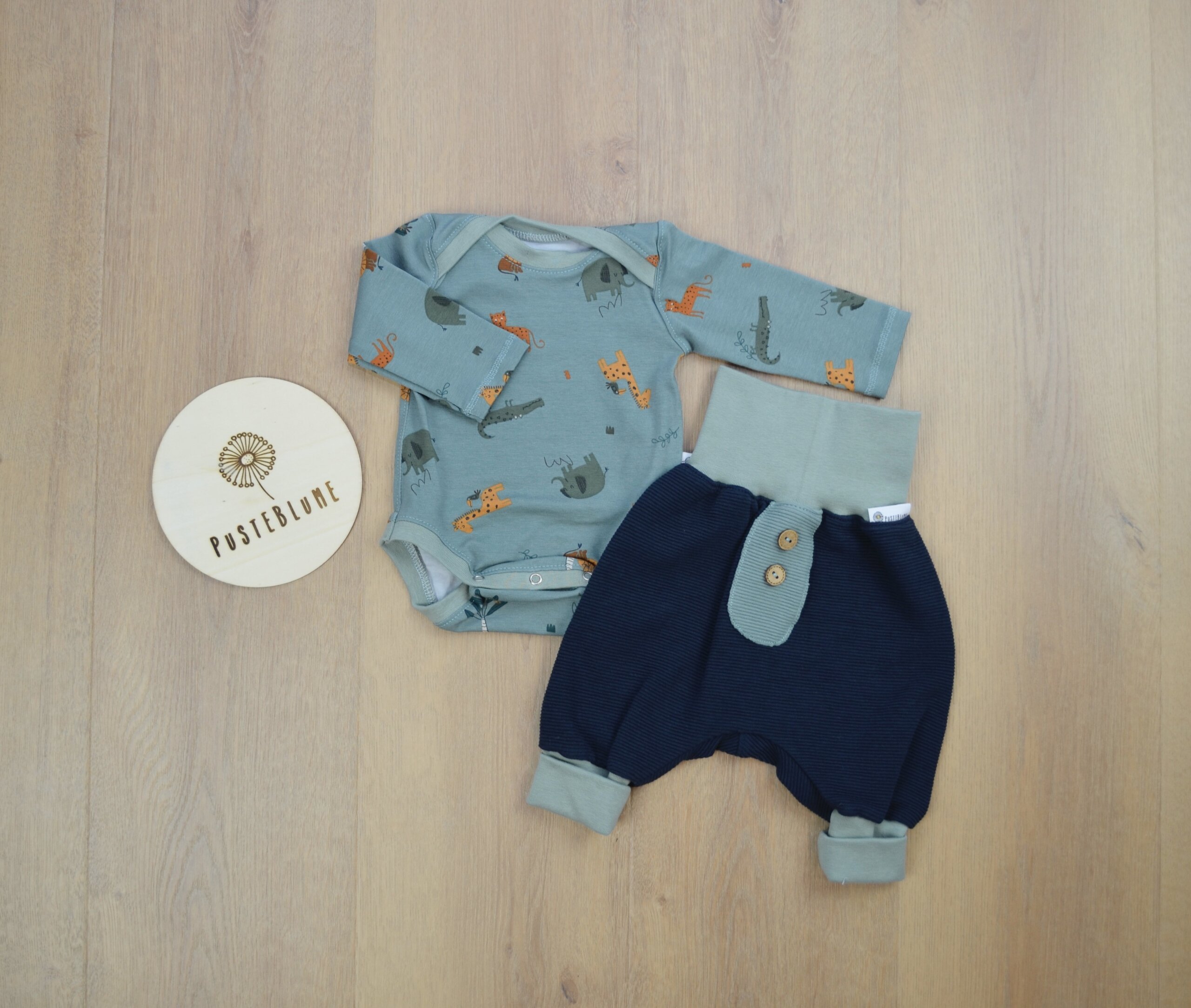 Ein liebevoll gestaltetes Baby Set Safari-Tiere für Neugeborene. Es besteht aus einem Body und einer Pumphose. Das ideale Willkommensgeschenk für neuen Nachwuchs.
